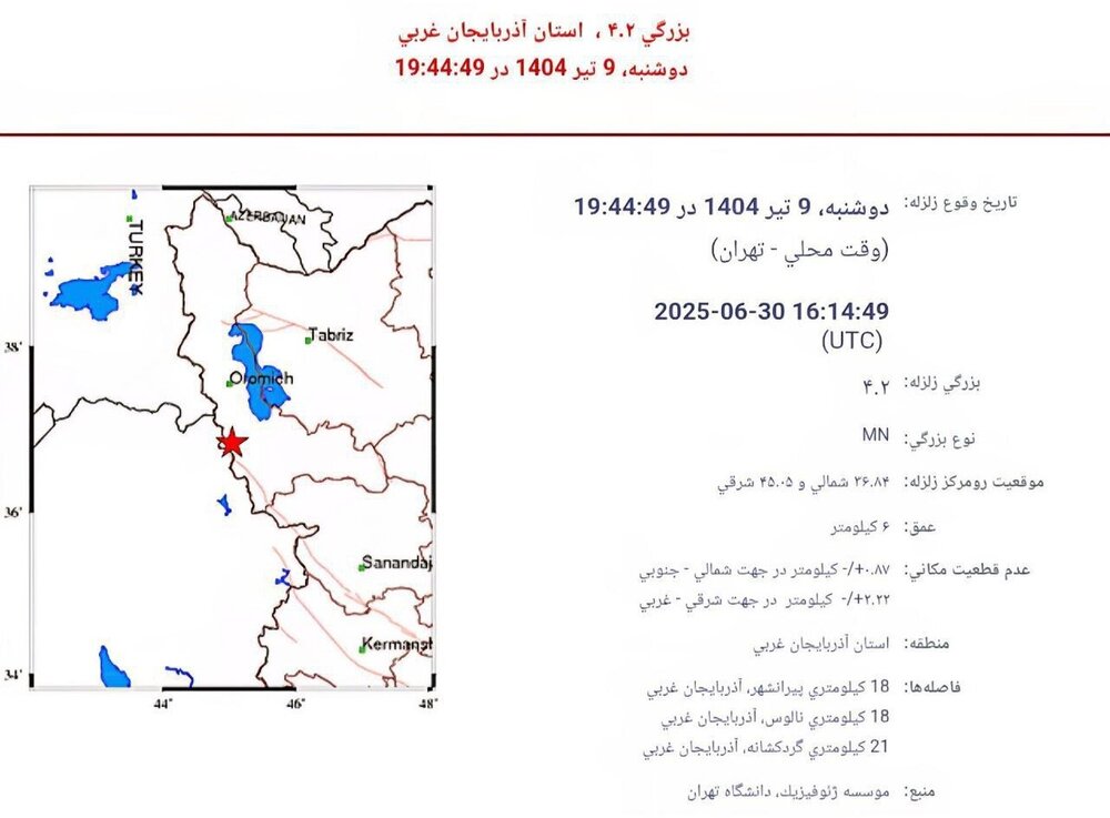 به گزارش سلام نو، دوشنبه ۹ تیر ماه ۱۴۰۴؛ زلزلهای به بزرگی ۴.۲ ریشتر در حوالی شهرستان پیرانشهر آذربایجانغربی و عمق ۶ کیلومتری سطح زمین، ساعت ۱۹:۴۴ به وقوع پیوست.