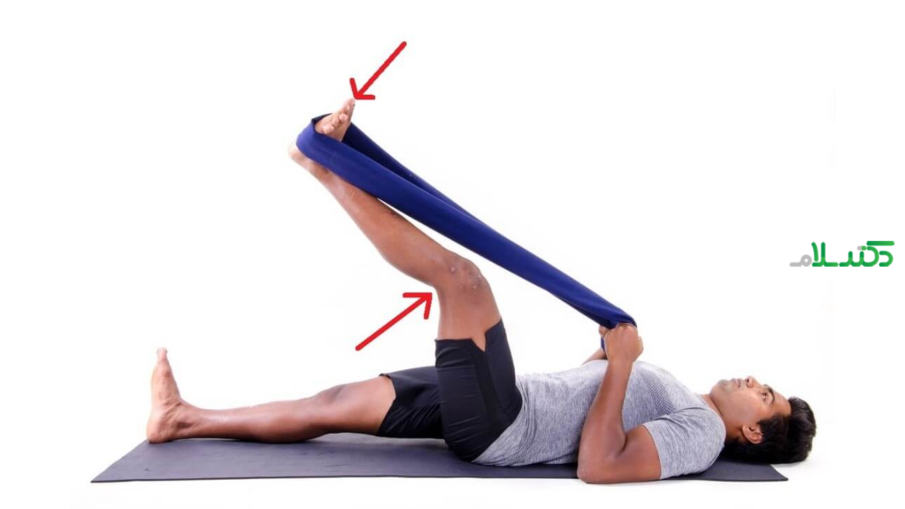 روی زمین یا تخت صاف بنشینید و یک پا را صاف دراز کنید.