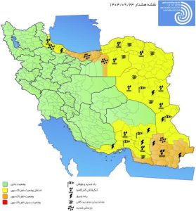 بنابر اعلام سازمان هواشناسی با ادامه بارش برف و باران، هشدار سطح نارنجی، برای استانهای، مازندران، غرب گلستان، ارتفاعات سمنان، نیمه جنوبی استانهای سیستان و بلوچستان و هرمزگان، صادر شده است.