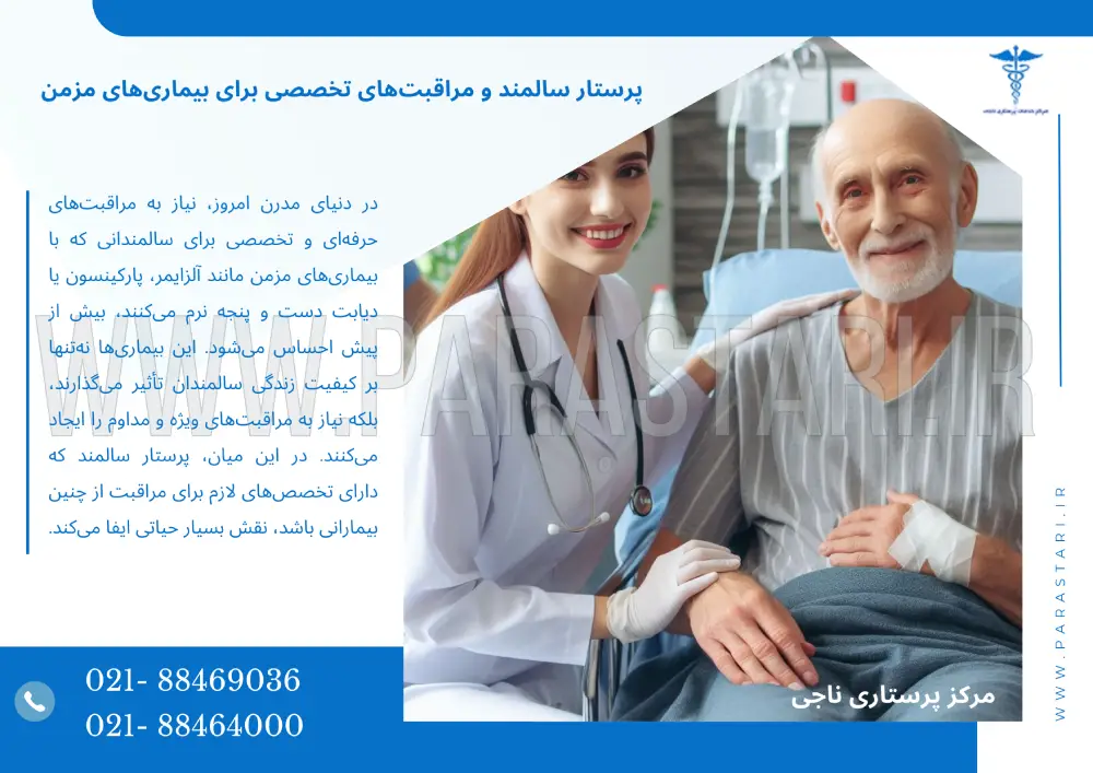 مراقبت از سالمندان مبتلا به بیماریهای مزمن، نیازمند تخصص و تجربهی بالایی است. پرستار سالمند با ارائه مراقبتهای ویژه و حرفهای، میتواند بهبود قابل توجهی در کیفیت زندگی این سالمندان ایجاد کند. مرکز پرستاری ناجی با شماره تماس ۸۸۴۶۴۰۰۰ – ۸۸۴۶۹۰۳۶ (021) آماده ارائه خدمات پرستار در منزل به سالمندان شماست تا در محیطی آشنا و آرام، بهترین مراقبتها را دریافت کنند. انتخاب پرستار سالمند مناسب، گامی مهم در جهت حفظ سلامتی و آرامش سالمندان عزیز شماست.